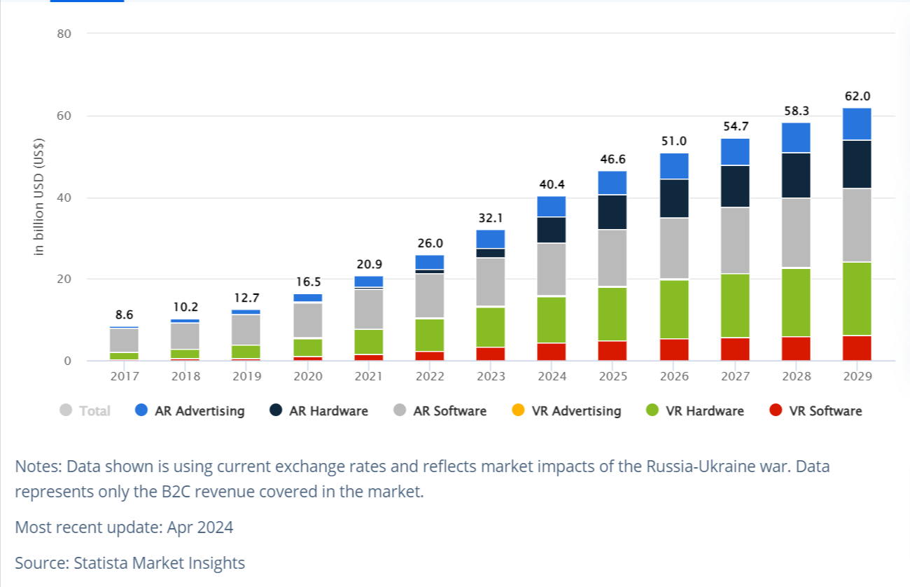 AR and VR technologies are transforming the way customers interact with products online. Over the next five years, this sector is expected to grow 9% and reach a valuation of $62Bn by the year 2029.