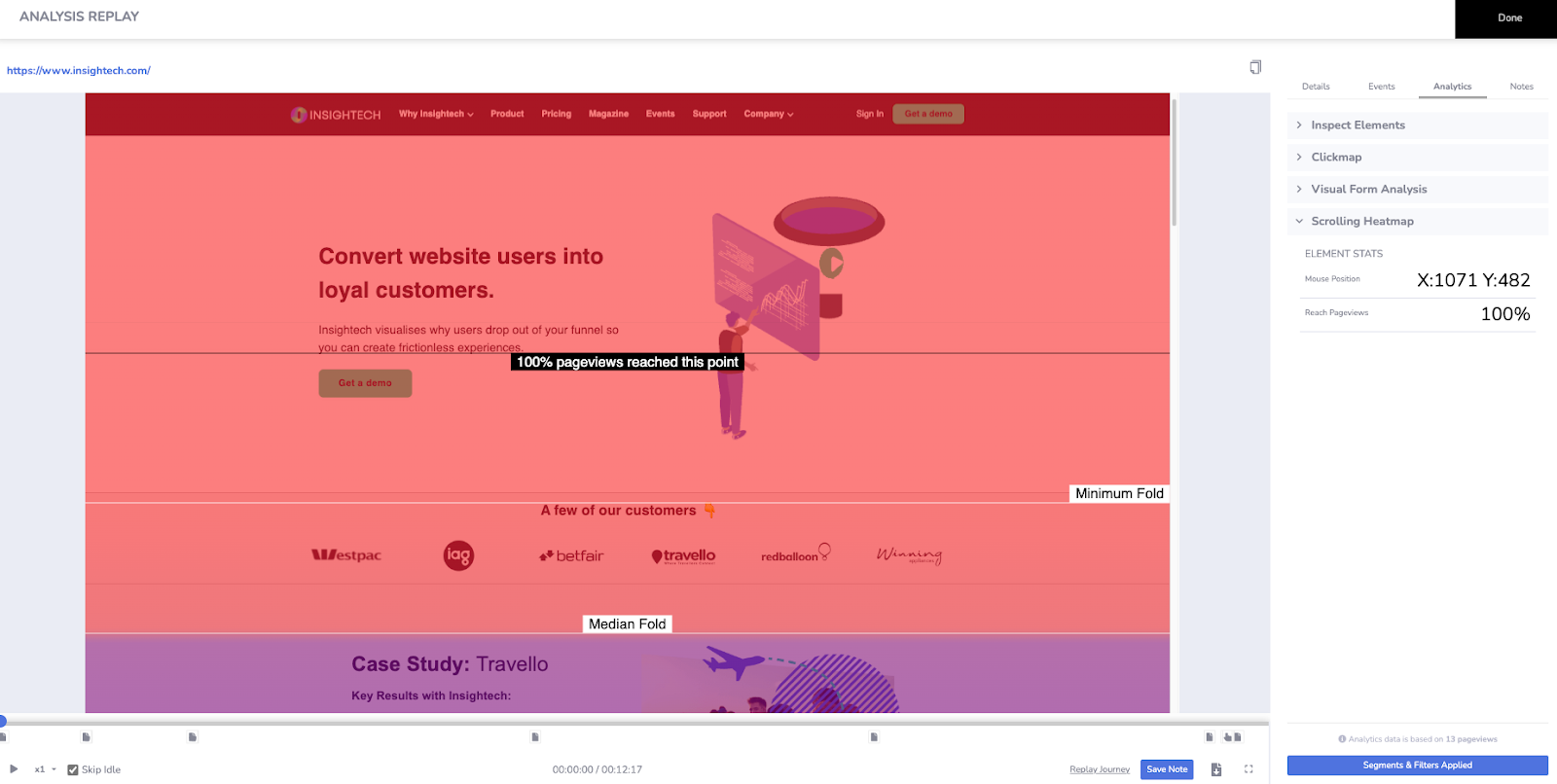 Insightech elevates user experience tracking by precisely recreating user interactions using your website’s own code. This allows for interactive segmentation and filtering, rather than simply providing a video recording.