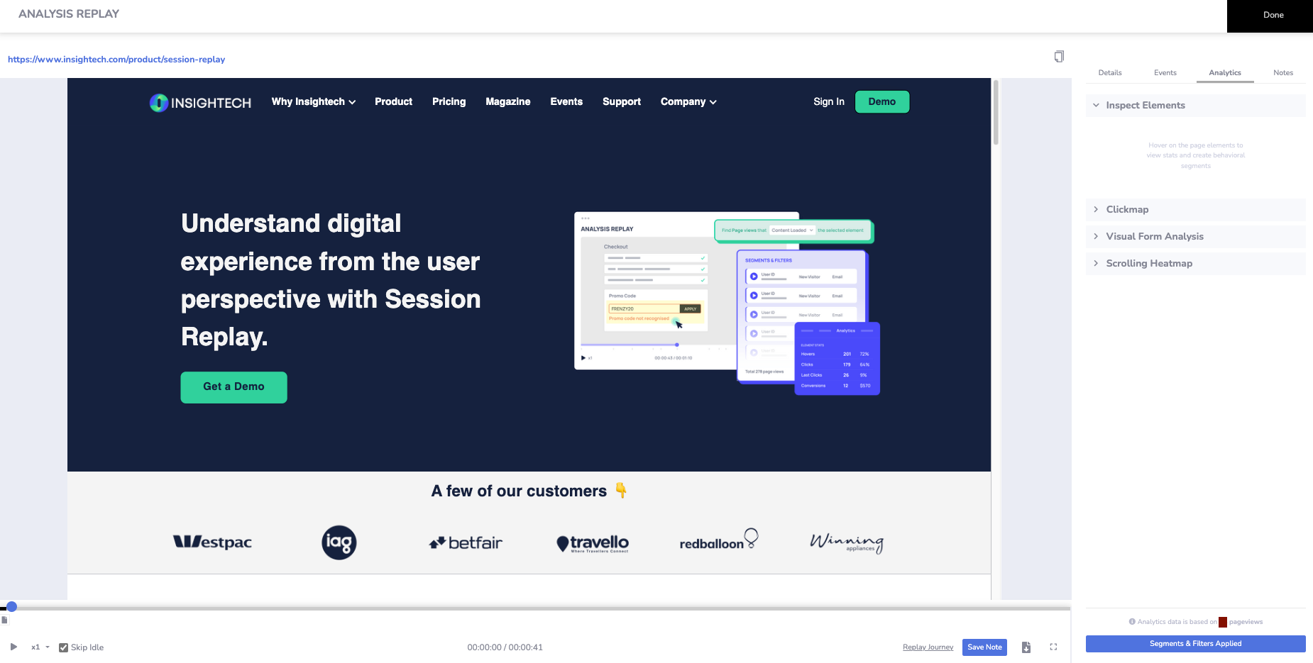 Insightech includes interactive session replay out of the box. You can benefit from a variety of in-built tools such as