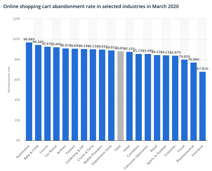 - Cart abandonment rates have increased year on year and sit between 70-90% across industries