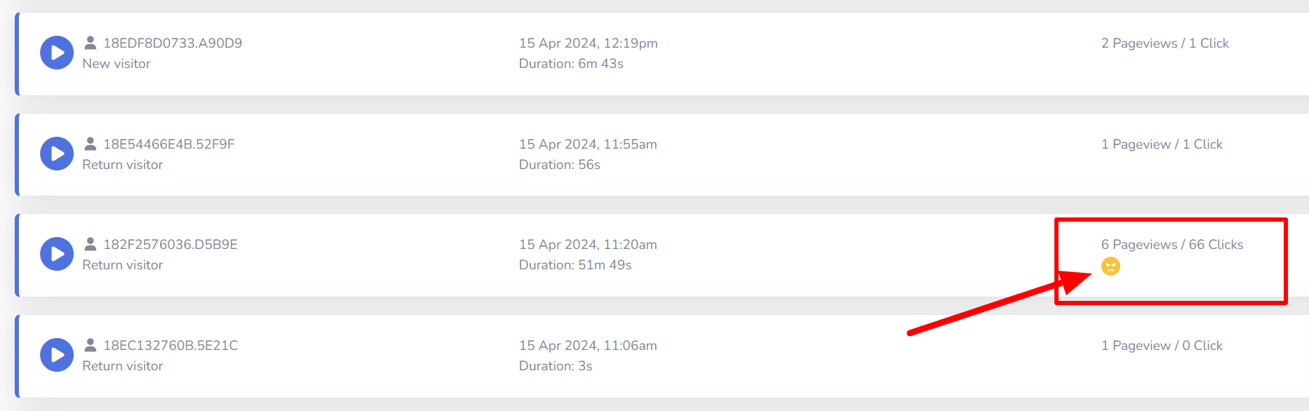 With Insightech you could filter session replays and focus on sessions recording rage click behaviours (as indicated by the angry face icon).