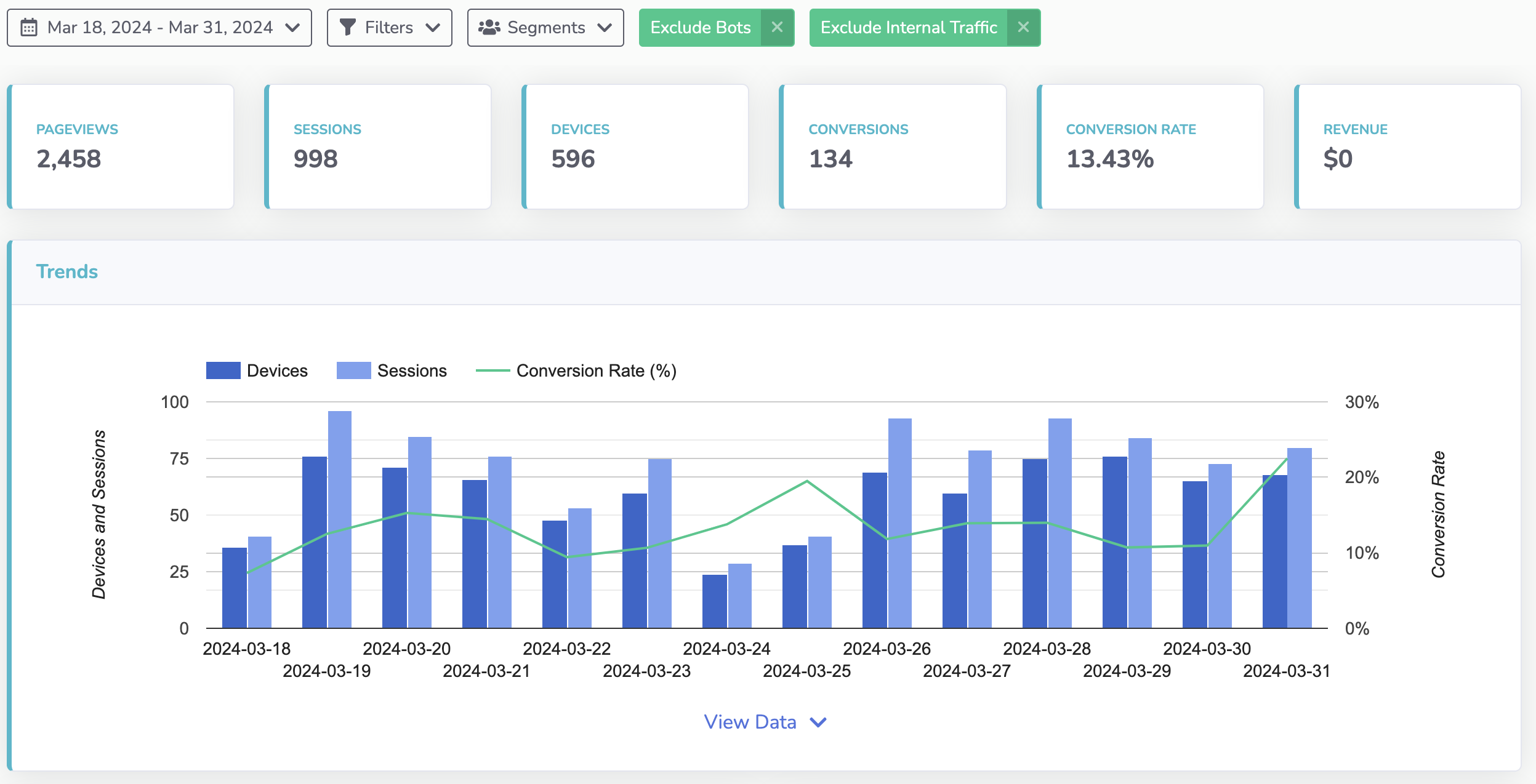 Here is a typical website performance dashboard. You can see the conversion rate is 13.43% and it has been trending up the last few days. But why?