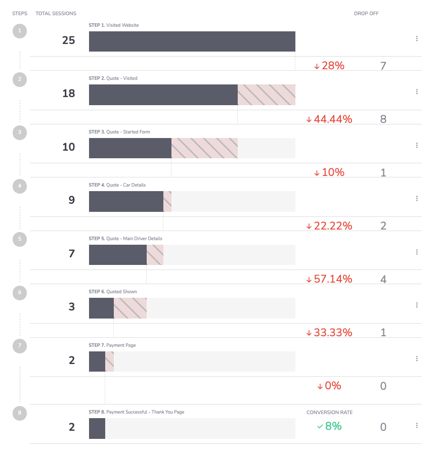 Setup your conversion funnels in Insightech to quickly click into and watch relevant replays for users who either made it to the next step or dropped off