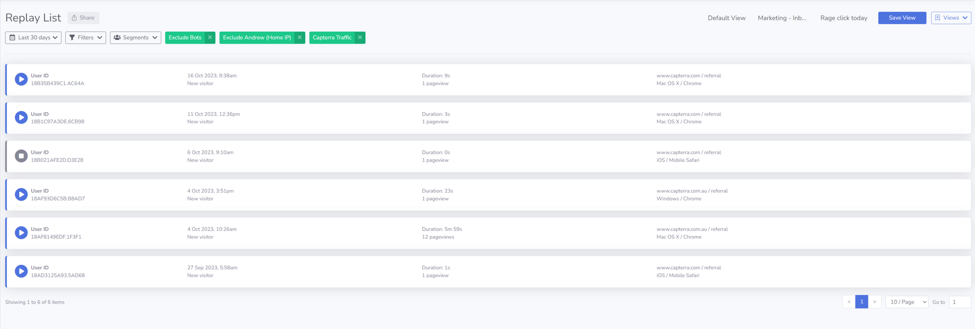 Here I’ve filtered my replays by users who visited Insightech from Capterra in the past 30 days
