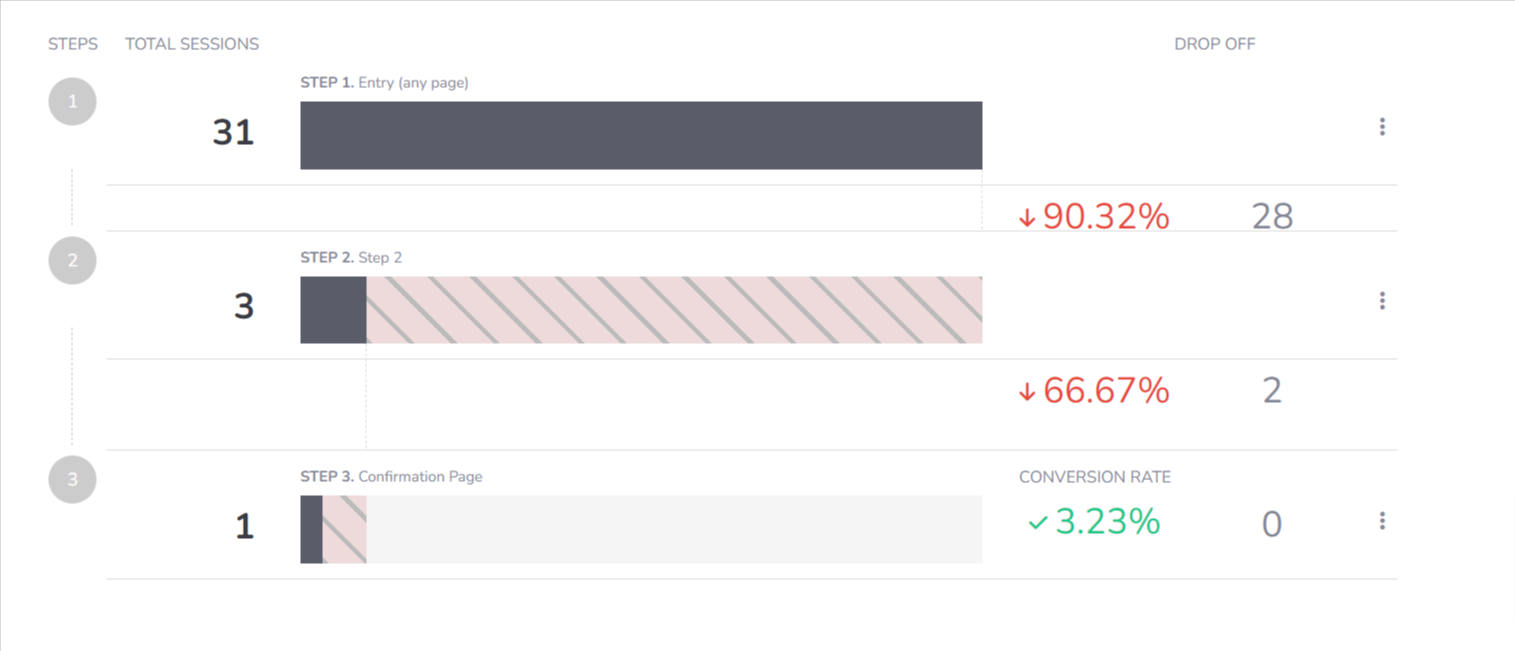 You can filter your conversion funnel reports to only show those customer journeys that experienced a rage click (or a rage click on a specific page content element such as an add-to-cart button or an error message that pops up when a user tries and fails to submit an application form on your website).