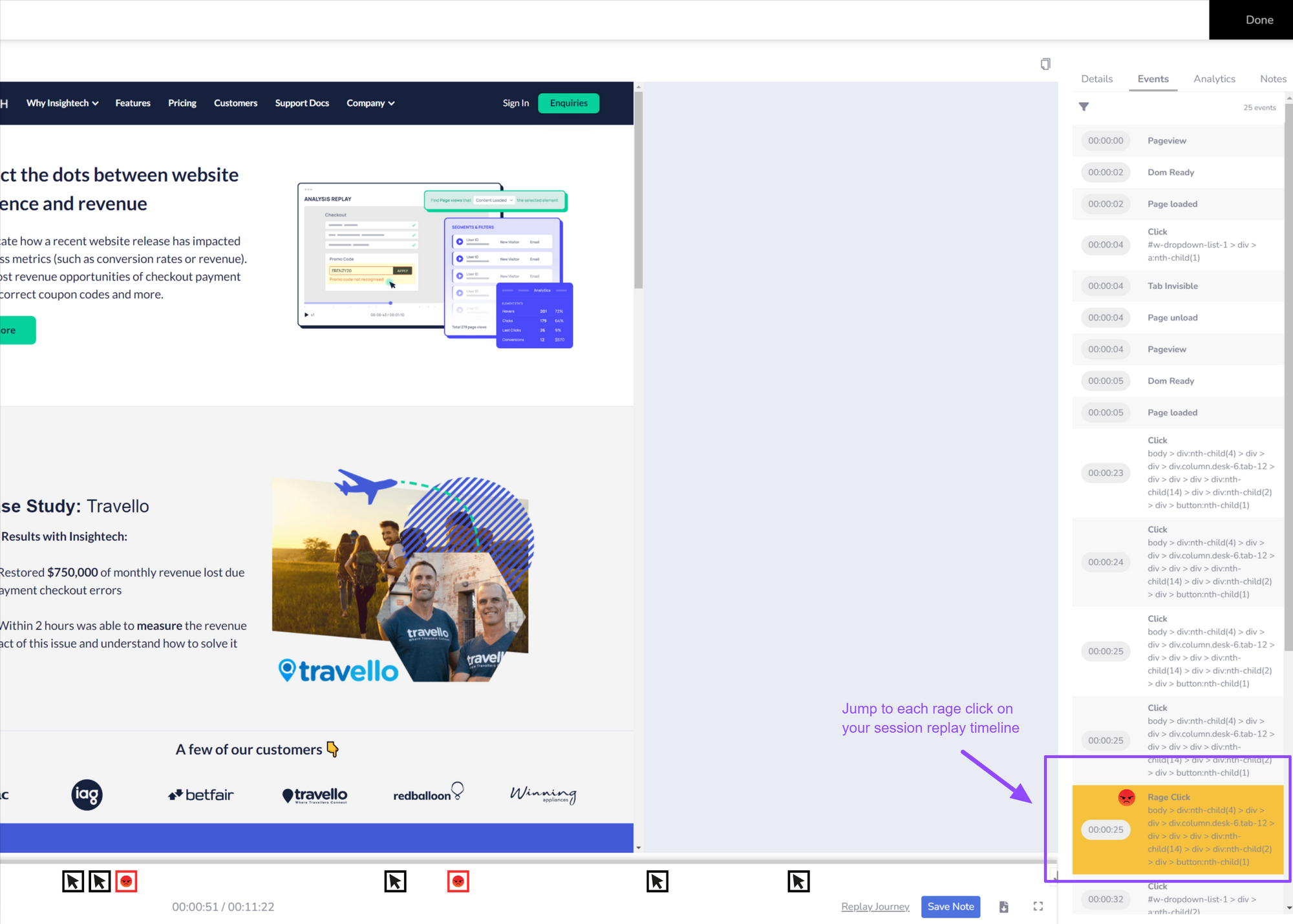Find and analyse rage-click events from your timeline view - instantly jump to that point on the replay recording!